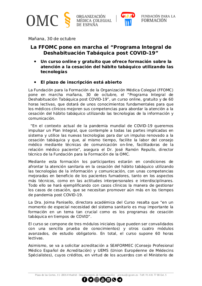 La FFOMC pone en marcha el “Programa Integral de Deshabituación Tabáquica post COVID-19” Pulse aquí o sobre la imagen para acceder a la nota de prensa Anterior Siguiente