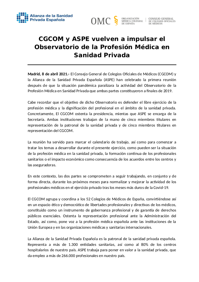 El primer objetivo es el de promover la actualización del nomenclátor de cada especialidad junto con las sociedades científicas y mediante el convenio que la OMC tiene firmado con Unión Española de Entidades Aseguradoras y Reaseguradoras (UNESPA). Por otra parte, se ha esbozado la cronología de todas las acciones que van a desarrollar y las reuniones que tendrán lugar con los actores implicados: pacientes, Comisión Nacional de Mercados y Competencias (CNMC), Organización de Consumidores y Usuarios (OCU), Ministerio de Sanidad, UNESPA, Alianza de la Sanidad Privada Española (ASPE) y grupos hospitalarios.