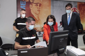 La titular de Defensa visitó, junto al ministro de Sanidad, Salvador Illa, el Cuartel General de la UME en Torrejón de Ardoz (Madrid) para conocer de primera mano la labor de rastreo que están realizando los militares para evitar la expansión de la Covid-19 en Madrid.
