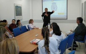 En él, se está dando asesoramiento en materia de seguridad, orientando al profesional sanitario sobre los pasos a seguir ante una agresión o aclarando dudas sobre qué tipo de hechos son constitutivos de delito y por tanto denunciables.