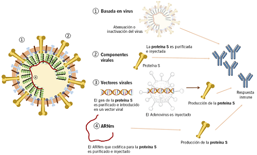 Las estrategias para desarrollarlas son variadas, algunas vacunas han optado por un enfoque clásico como las vacunas de: virus vivos atenuados, virus inactivados o de subunidades virales. En otros casos, se han empleado estrategias más novedosas, como las vacunas de ARNm y el uso de vectores virales. Entre las vacunas más destacadas están las de Moderna y Pfizer, ambas de ARNm; las vacunas de Astra Zeneca y del instituto de investigación de Gamaleya de vectores virales; la vacuna de Sinovac, de virus inactivados; y la de Novavax de subunidades. Todas estas vacunas utilizan como antígeno la proteína espicular (Spike [S]) del coronavirus.
