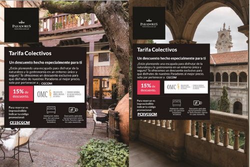 Para realizar la reserva el beneficiario debe indicar el código promocional correspondiente: Año 2021: CE15CGCM y Año 2022: PCXVCGCM, e identificarse como colegiado o empleado del CGCOM o de alguno de los Colegios Oficiales (a su llegada al establecimiento deberá presentar un documento oficial que lo acredite como beneficiario).