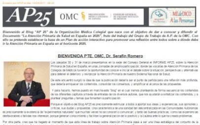El Consejo General de Colegios de Médicos (CGCOM) pone en marcha el "BlogAP25" que nace con el objetivo de dar a conocer y difundir el Documento “La Atención Primaria de Salud en España en 2025”, fruto del trabajo del Grupo de Trabajo de A.P. de la corporación. Esta nueva herramienta forma parte de un Plan de acción interactivo para promover una reflexión entre todos sobre hacia dónde debe ir la Atención Primaria en España en el horizonte 2025. El primer post está firmado por el presidente del CGCOM, Dr. Serafín Romero, quien anima a aportar, ideas, experiencias, opiniones y también dudas y propuestas, con el fin de revitalizar la Primaria