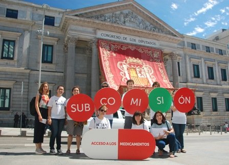 Frente al Congreso, los miembros de No es Sano reclamaron a los diferentes partidos políticos que den luz verde a la Subcomisión sobre acceso a medicamentos cuya aprobación se está negociando en la Comisión de Sanidad. Los objetivos de este grupo de trabajo, propuesta de Podemos, recoge muchas de las peticiones que la campaña ha venido defendiendo y trasladando a los diferentes partidos políticos, como analizar y evaluar los nuevos modelos de financiación de medicamentos; desarrollar una estrategia de transparencia en I+D con fondos públicos; y plantear el papel de España en el diseño de alternativas que favorezcan la I+D más vinculada a las necesidades de salud.