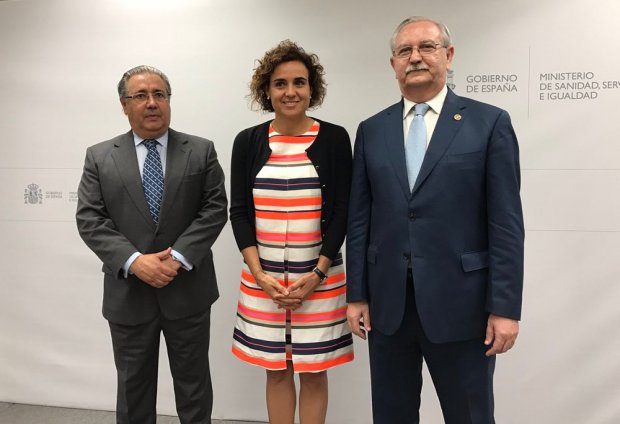 El ministro del Interior, Juan Ignacio Zoido, presentó junto a la ministra de Sanidad, Servicios Sociales e Igualdad, Dolors Monserrat, y el presidente de la Organización Médica Colegial (OMC), Dr. Serafín Romero, la Instrucción 3/2017 de la Secretaría de Estado de Seguridad del Estado sobre medidas policiales a adoptar frente a agresiones a profesionales de la salud, dando respuesta así al compromiso contraído recientemente por el propio ministro con el equipo directivo de la OMC