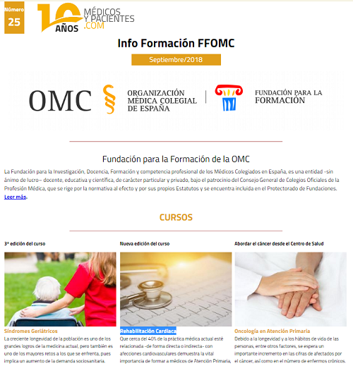 La Fundación para la Formación de la Organización Médica Colegial (FFOMC) pone en marcha en octubre dos actividades formativas, la tercera edición del Curso "Lo que hay que saber sobre los Síndromes Geriátricos" y la segunda edición del Curso de "Rehabilitación Cardiaca para Profesionales de Atención Primaria", tal y como recoge el nº 25 de su Boletín "Info Formación FFOMC
