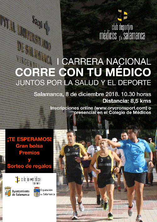Salamanca acoge el próximo 8 de diciembre la I Carrera Nacional "Corre con tu Médico. Juntos por la salud y el deporte". La prueba, de carácter popular, está organizada por el Colegio Oficial de Médicos de Salamanca y pretende reunir en la capital salmantina a médicos locales y del resto de España, aficionados al running, para compartir una carrera con ciudadanos en general, con el fin de fomentar el deporte y el ejercicio físico como una estrategia de salud en la que está comprometido el médico.