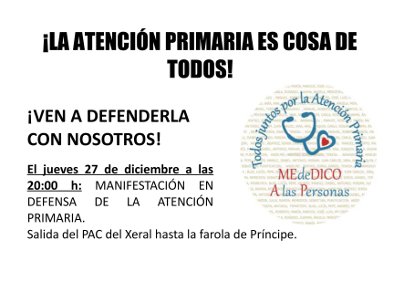 Médicos de Familia y de PAC y pediatras se reunieron, recientemente, en el salón de actos del Colegio de Médicos en su sede en Vigo convocados por la Junta de Jefes de Servicio y Unidad Dimitidos, en donde se tomaron una serie de acuerdos, entre ellos, convocar una manifestación para este jueves 27 de diciembre a las 20 horas, con el apoyo de la Xunta de Personal do EOXI de Vigo, de asociaciones profesionales entre otras AGAMFEC y AGAPAP, convocando a la población bajo el lema: "Por la Dignidad de la Atención Primaria".