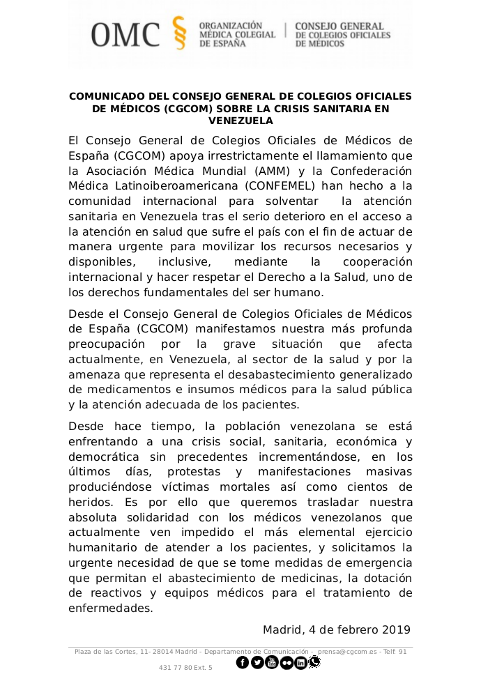 Comunicado del Consejo General de Colegios Oficiales de Médicos sobre la crisis sanitaria en Venezuela Pulse aquí o sobre la imagen para acceder al comunicado adjunto Anterior Siguiente