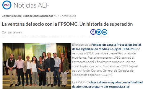 La Asociación Española de Fundaciones (AEF), de la que es socia la Fundación para la Protección Social de la Organización Médica Colegial (FPSOMC), ha puesto en marcha una nueva iniciativa con el fin de mejorar la visibilidad de sus asociadas. La ventana del socio es un nuevo espacio del boletín de noticias con historias de impacto positivo en la vida de las personas.