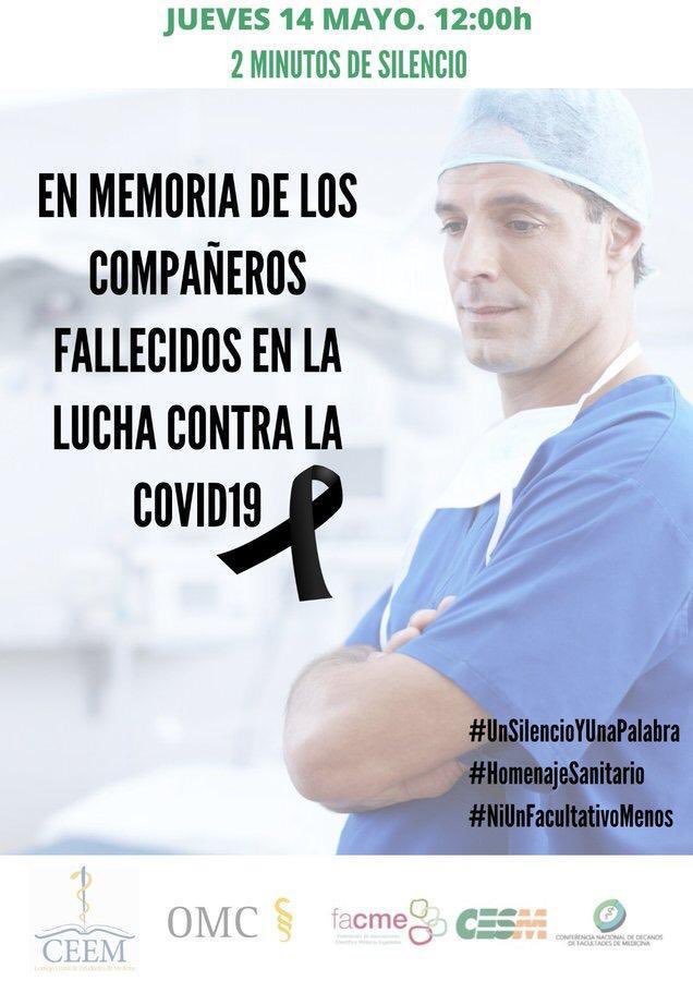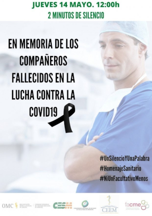 El Foro de la Profesión Médica de España (FPME), a iniciativa de la Confederación Estatal de Sindicatos Médicos (CESM), homenajeará, hoy a las 12.00h con dos minutos de silencio, a los cerca de 50 médicos que se han dejado la vida por estar en primera línea de esta batalla