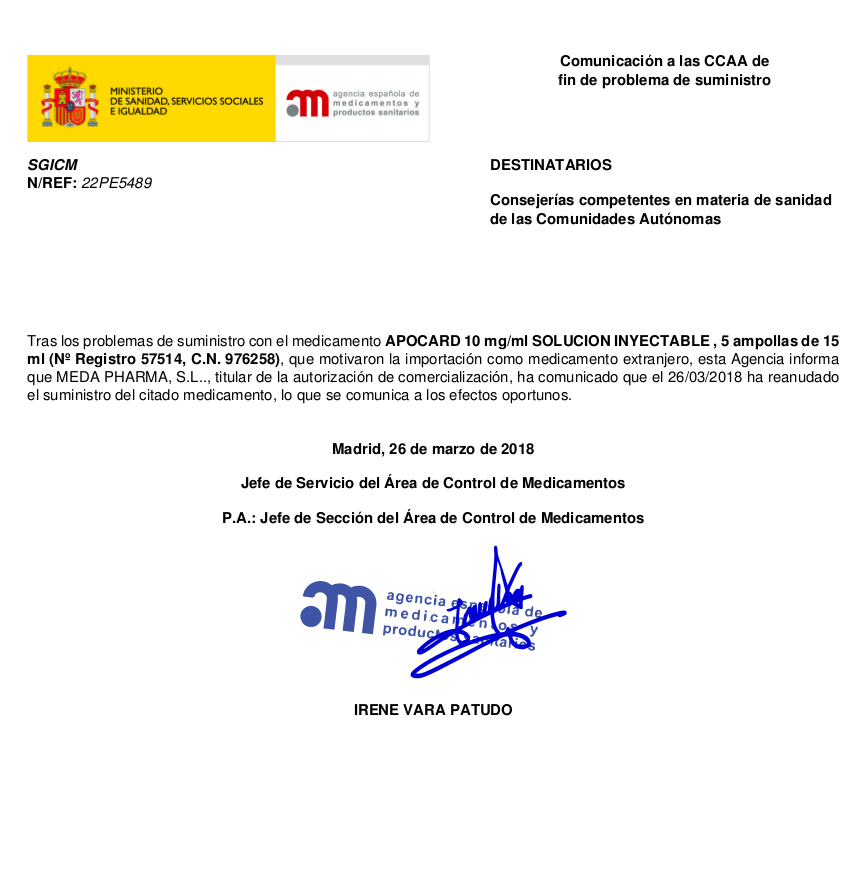 Nota informativa sobre el medicamento APOCARD 10mg/ml SOLUCIÓN INYECTABLE Pulse aquí o sobre la imagen para acceder a la nota completa Anterior Siguiente