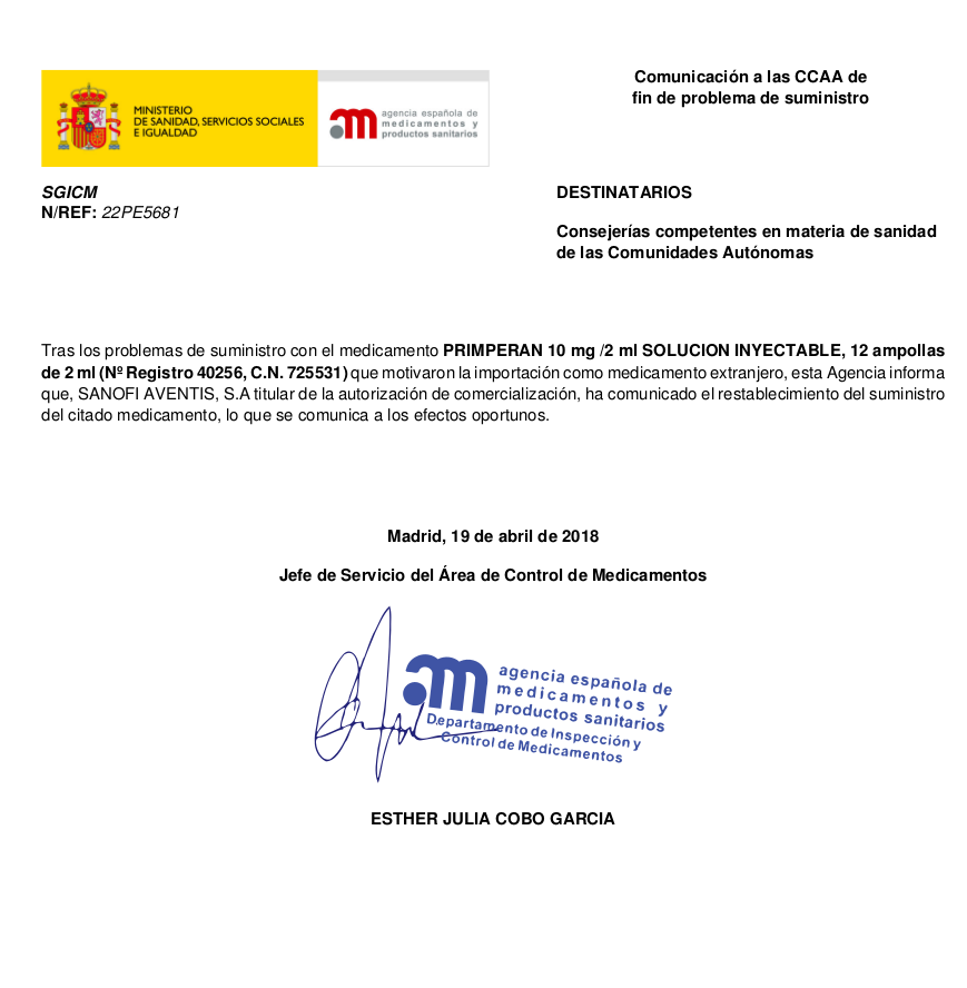 Nota informativa - PRIMPERAN 10mg / 2ml Pulse aquí o sobre la imagen para acceder a la nota informativa Anterior Siguiente