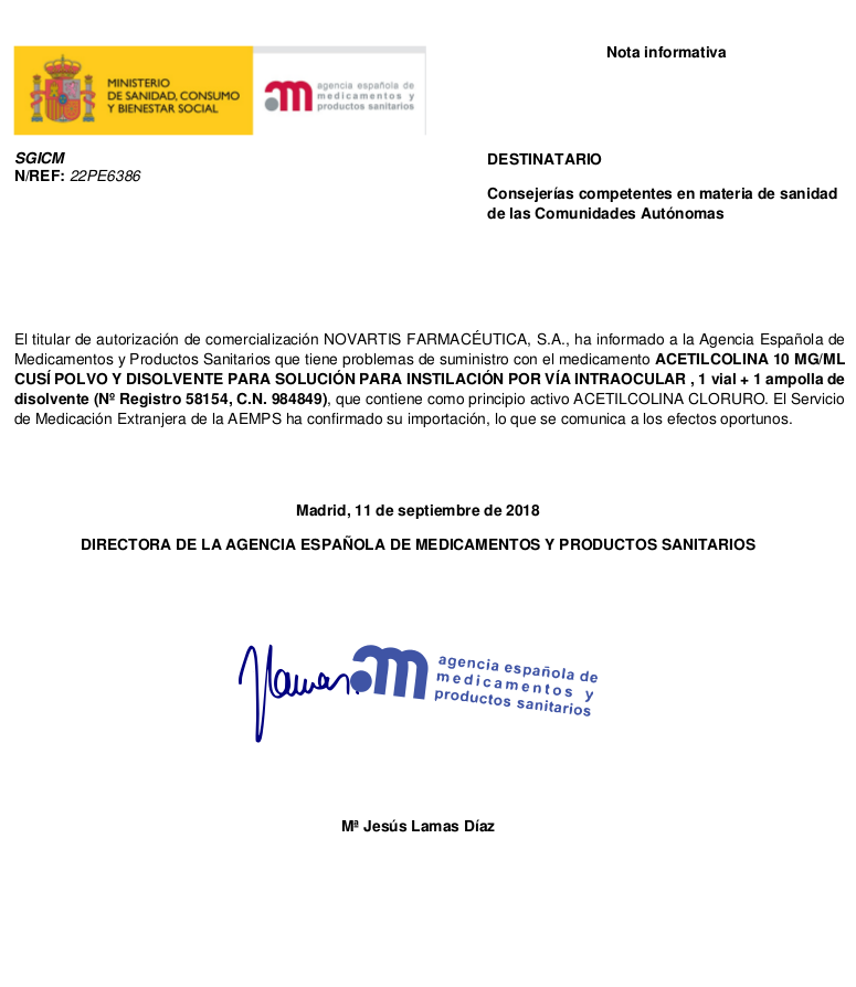 Nota informativa - Acetilcolina 10mg/ml intraocular Pulse aquí o sobre la imagen para acceder a la nota informativa Anterior Siguiente
