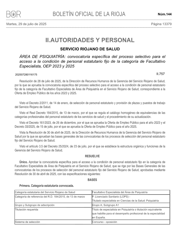 Convocatoria del Servicio Riojano de Salud del proceso selectivo para el acceso a la condición de personal estatutario fijo de la categoría de Facultativo Especialista en Psiquiatría OEP 2023 y 2025 Pulse aquí para acceder a toda la información Anterior Siguiente