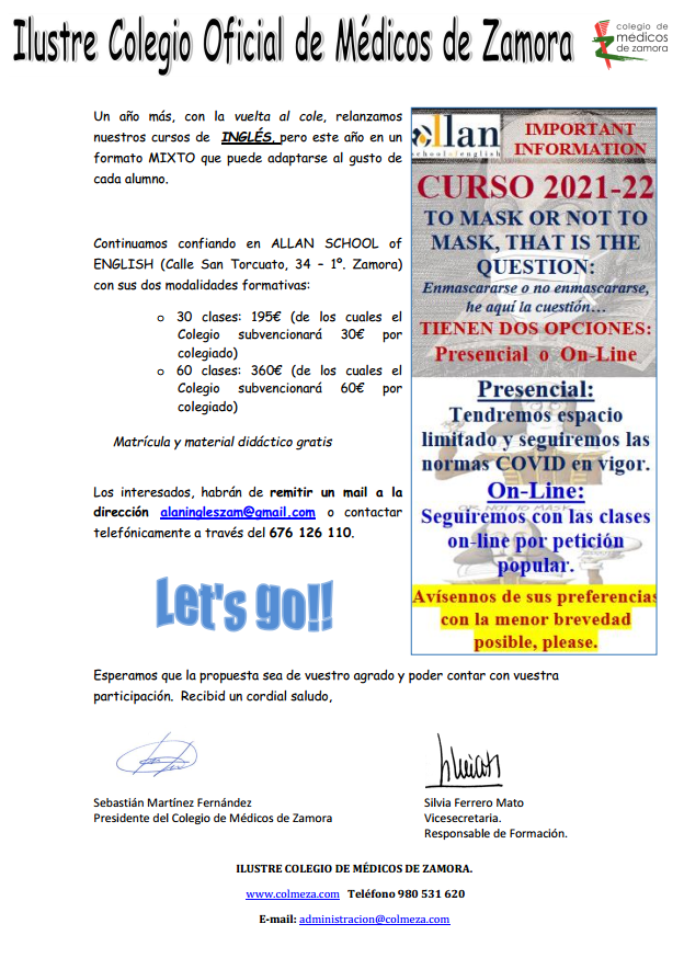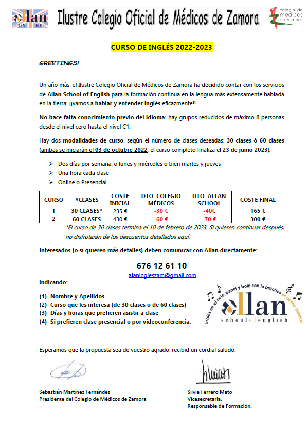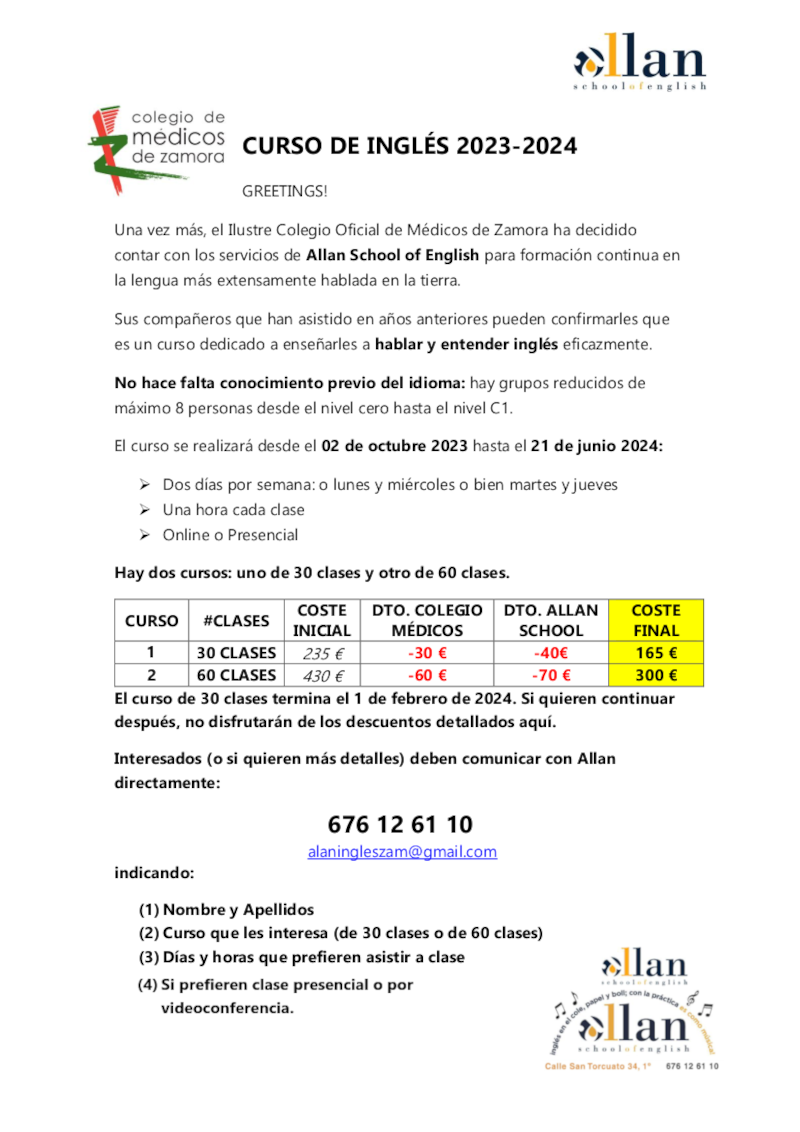 Una vez más, el Ilustre Colegio Oficial de Médicos de Zamora ha decidido contar con los servicios de Allan School of English para formación continua en la lengua más extensamente hablada en la tierra.