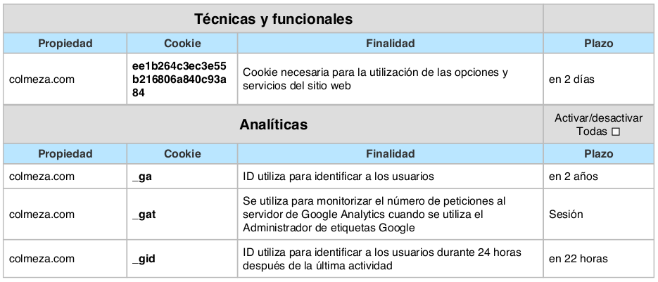 COOKIES UTILIZADAS EN ESTE SITIO WEB