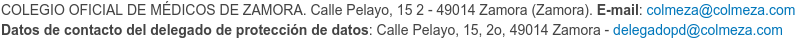 COLEGIO OFICIAL DE MÉDICOS DE ZAMORA es el Responsable del tratamiento de los datos personales del Interesado y le informa de que estos datos serán tratados de conformidad con lo dispuesto en el Reglamento (UE) 2016/679, de 27 de abril de 2016 (GDPR), por lo que se le facilita la siguiente información del tratamiento: